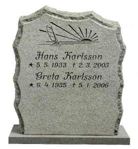 Hög smal gravsten GK1066-D med måtten 65 x 55 cm i ljusgrå granit, finhuggen framsida, råhuggna kanter, stil 8, text och dekor djupblästrade.